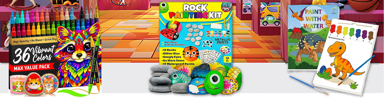 Products featured here are "Arts and Crafts Painting focused". They generally include essential supplies like various paints (acrylic, watercolor, tempera), brushes, and surfaces (canvas, paper, wood panels), plus tools such as palettes, easels, palette knives, and specialty items like stencils, airbrush kits, and craft paints for specific materials (glass, ceramics). You'll also find kits, markers, adhesives, and protective gear (drop cloths, workwear) to support a wide range of creative painting projects for all ages and skill levels.